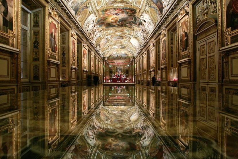 19) Сердце Лувра: Утонченный потолок галереи Апполо в Парижском Лувре отражается в витрине на переднем плане. Построенная в 1661 году, галерея была закончена только к 1851-му. В целом, над декорациями работало около 20 художников. Галерея Апполо содержит экспонаты французского искусства возрастом более двух веков и является домом для таких чудес, как Французские коронные украшения, включая знаменитые бриллианты Régent (140 карат) и Sancy (53 карата), а также рубин Côte de Bretagne (105 карат). (Joel Robine/AFP - Getty Images)