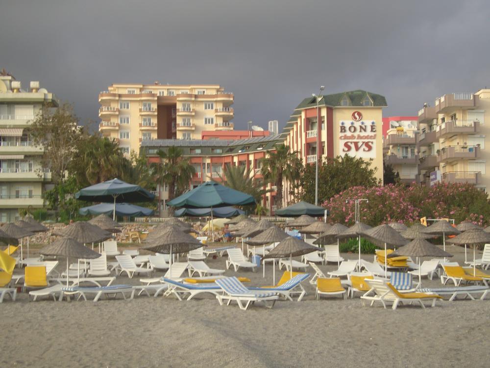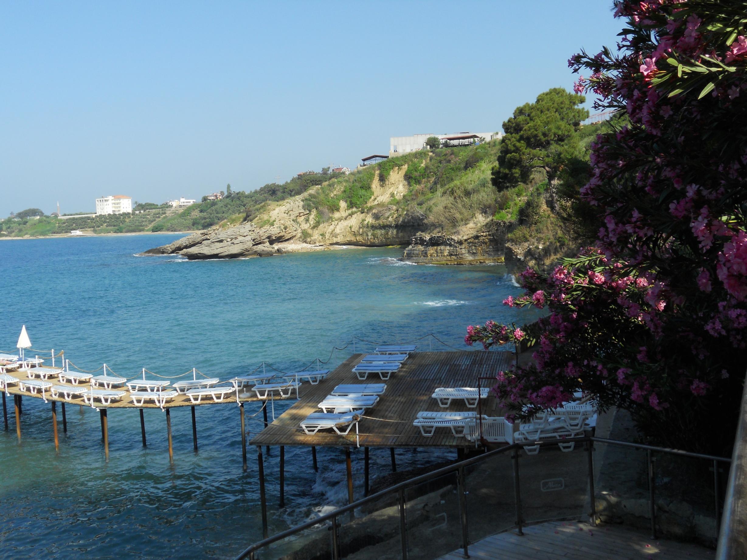 Из удобств, что характерно для отелей на 1 линии – это, конечно же, море, через дорогу с оборудованным пляжем, на котором за 2$ можно арендовать лежак. Рядом с входом в отель расположена остановка общественного транспорта, с которой за 10 минут можно добраться до шумного центра Алании, знаменитого пляжа Клеопатра и множества других достопримечательностей.