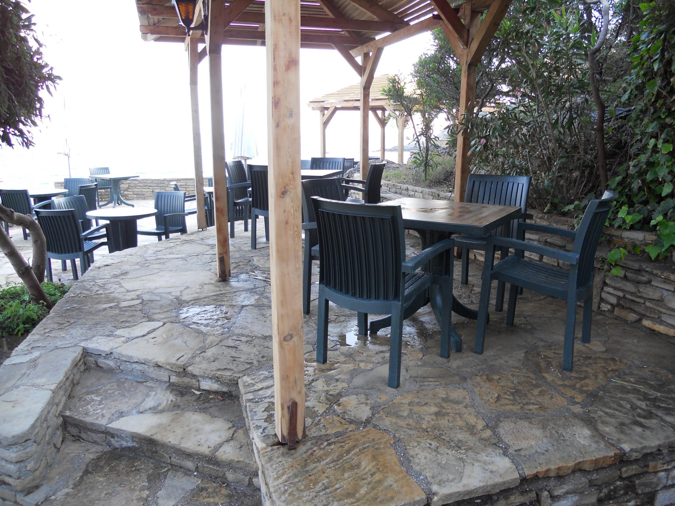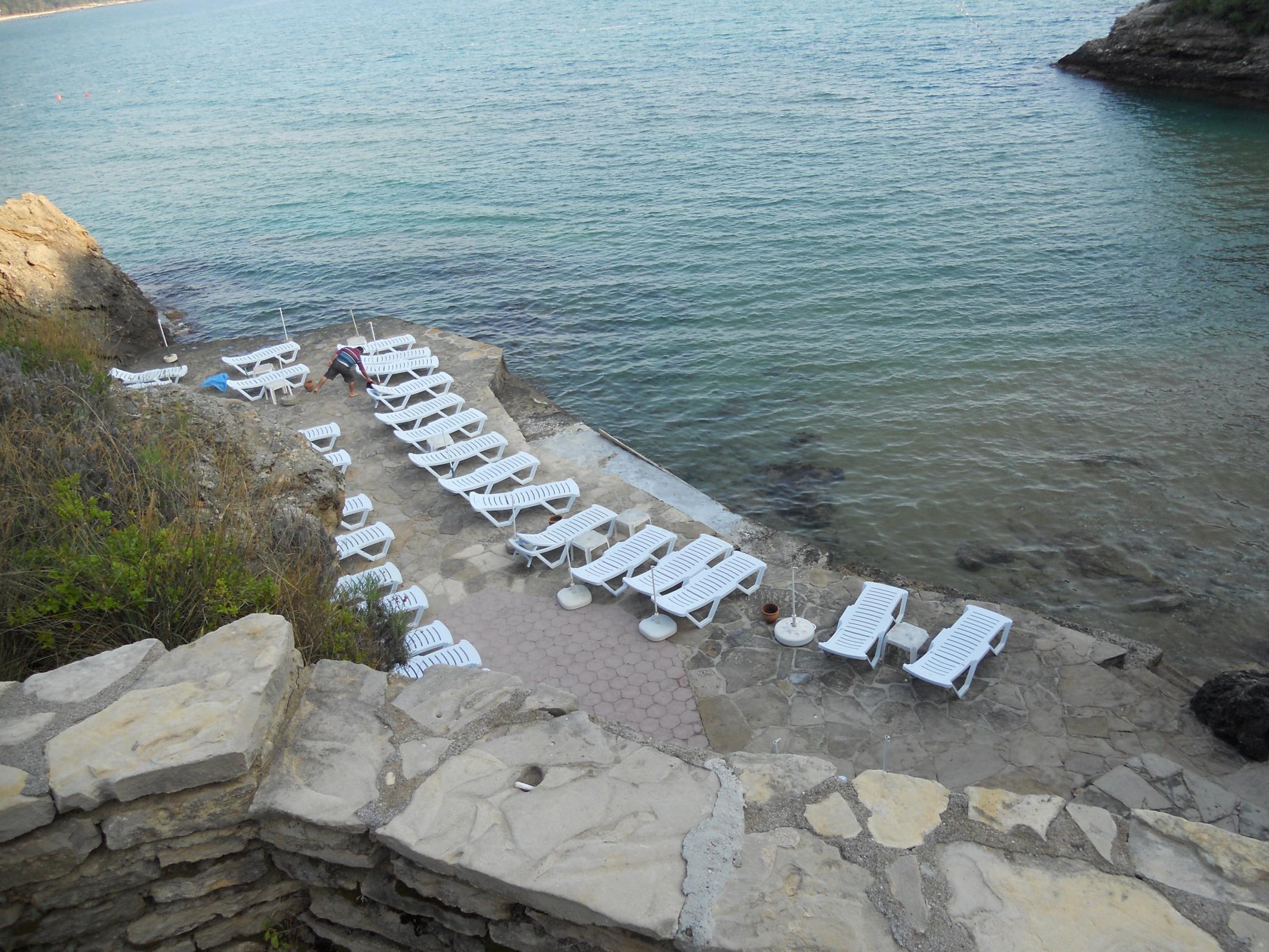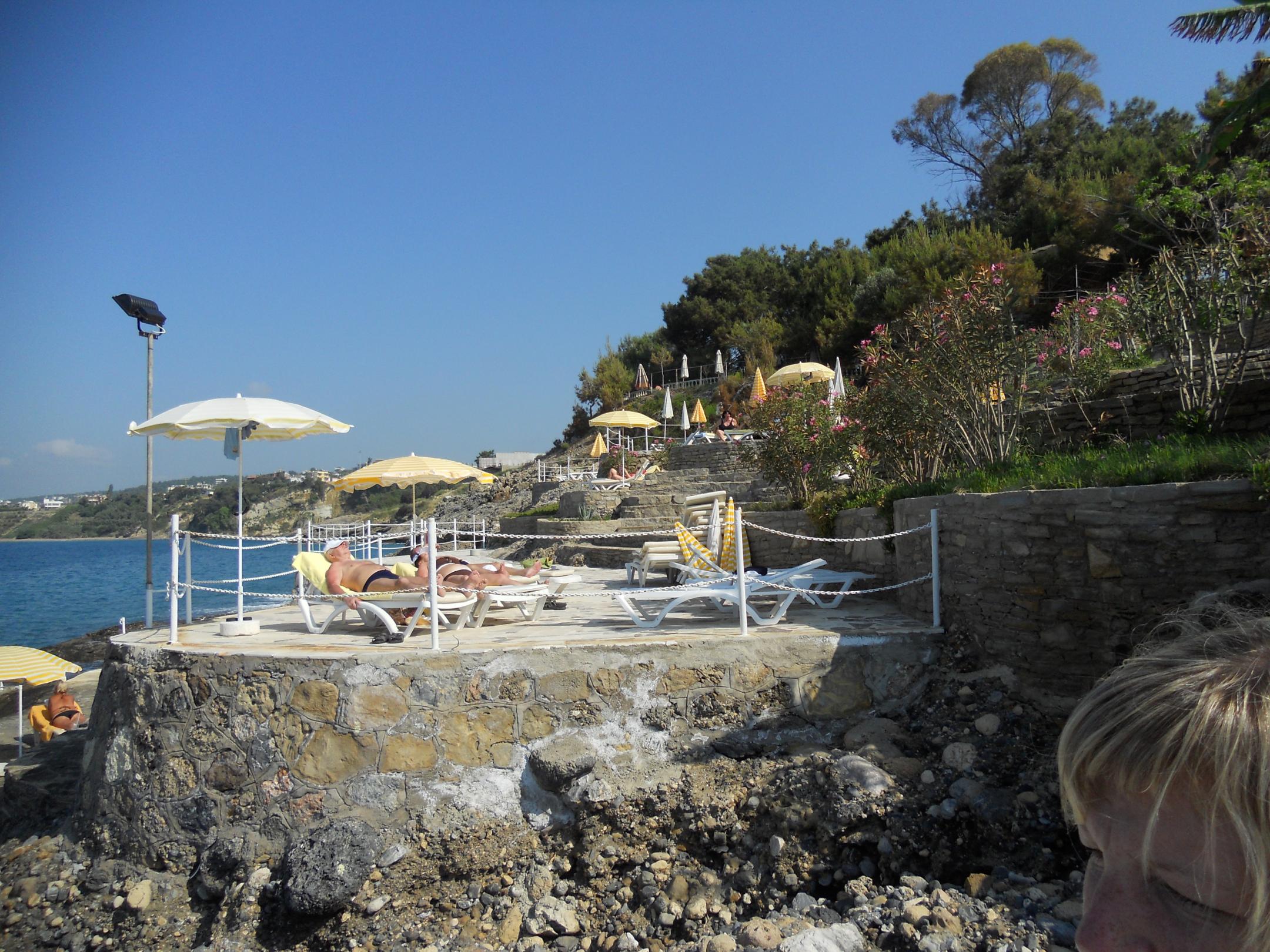 Отель на берегу моря, скалистый пляж, но есть заход в море, засыпанный песком. С детьми недостаточно удобно будет на этом пляже, так как бывает шторм и поцарапаться о скалы можно достаточно сильно.