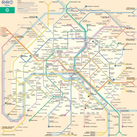 Сеть из 5 веток пригородных электричек RER тоже пронизывает город, местами дублирует метро и тянется далеко за город. В отличие от линий метрополитена, линии RER на карте более жирные и вместо цифр обозначены буквами латинского алфавита. Именно RER можно воспользоваться, если вы решите отправиться в пригороды, посетить Версаль или Диснейленд.