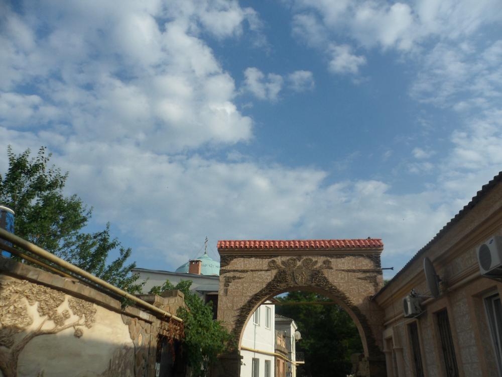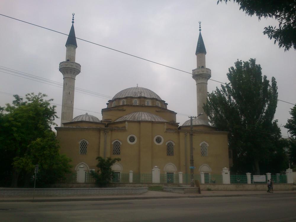 На набережной предлагают экскурсии по Евпатории на маленьком открытом автомобиле, но мы с детьми, верные своей привычке самостоятельно осматривать достопримечательности, сели в трамвай №1 и уже через четыре остановки были в районе старого города караимов. Начали экскурсию с мечети Хан-Джами - самой большой в Крыму. Она построена еще в 1552 году по проекту самого знаменитого из турецких архитекторов и по всему городу слышно призыв муэдзина к молитве, а ее два минарета видно буквально с любой точки города. Прогулка по старому городу, особенно когда спадет жара, вызывает ощущение поездки на машине времени: узкие улочки, выложенные брусчаткой, белые дома с рисунками на воротах и коваными листьями винограда на ставнях. Главное не поднимайте голову вверх – желтая газовая труба возвращает вас обратно, в настоящее.