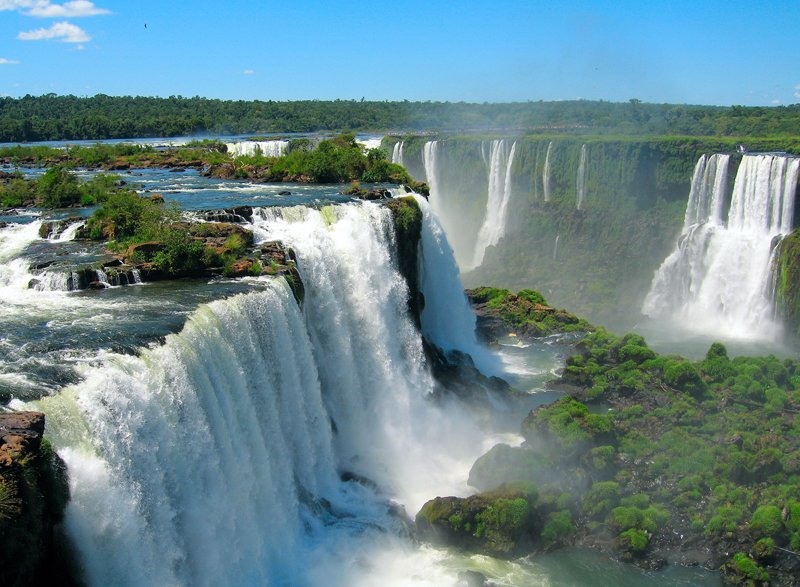 Вообще, природные достопримечательности Бразилии – отдельная большая тема. Можно сказать, что именно из-за них стоит отправиться на другой край Света и потратить кучу денег. Одни только водопады Игуасу окупят поездку ярчайшими и незабываемыми впечатлениями. Когда возникает возможность увидеть легендарные водопады, которыми гордится вся Бразилия стоимость не важна. Это самое настоящее чудо Света – гигантские потоки воды, падающие с высоты 72 метра с колоссальным шумом. Игуасу раскинулись между тремя странами – Аргентиной, Бразилией и Парагваем, поэтому в каждой из них имеется своя частичка водопадов, побывать на которой можно только оказавшись на территории соответствующего государства. Грохот водопадов Игуасу можно услышать с большого расстояния, а брызги от падающей воды создают фантастическую радугу.