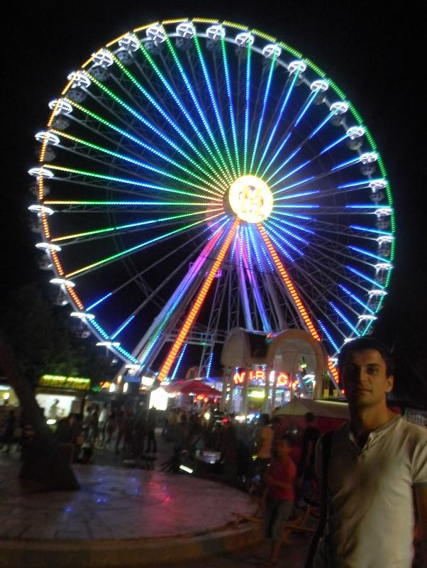 Так же хочу отметить, что в вечернее время билеты на аттракционы приобрести сложно и необходимо простоять долгое время в очереди. Человек 50 не меньше стоит в каждую кассу. Кроме колеса обозрения есть и другие аттракционы для экстремалов, но мне такое не интересно и я даже не стала запечатлять их фото. Относительно колеса обозрения, то оно открывает вид на город и мне было интересно прокатиться на нем. Видно море, набережную, всех людей, которые толпами ходят по ней .