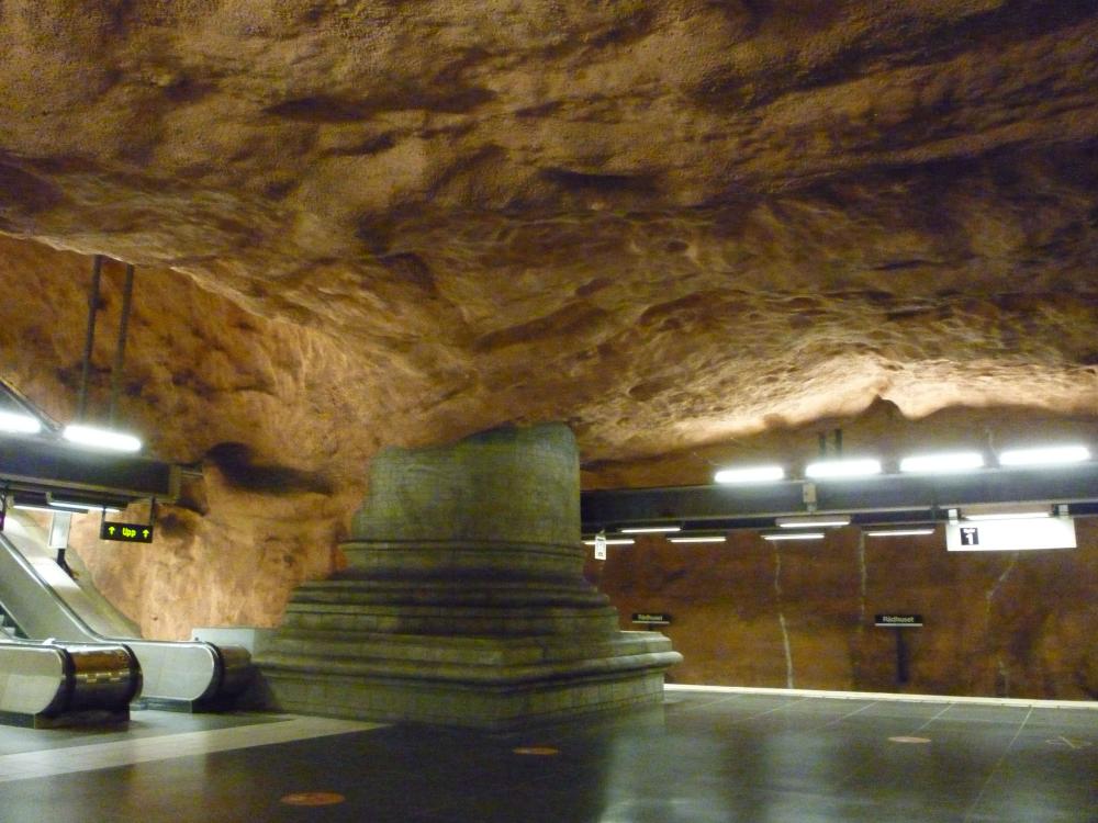 Метро в Стокгольме известно как "самая длинная подземная художественная галерея в мире". Дело в том, что многие станции имеют очень необычный декор. Многие из них сделаны в виде скальной пещеры, там можно увидеть самые неожиданные скульптуры - башмаки, летающие динозавры, например. Встречаются необычные росписи в виде радуги или наскальных рисунков, а также современные "картины" в переходах.
