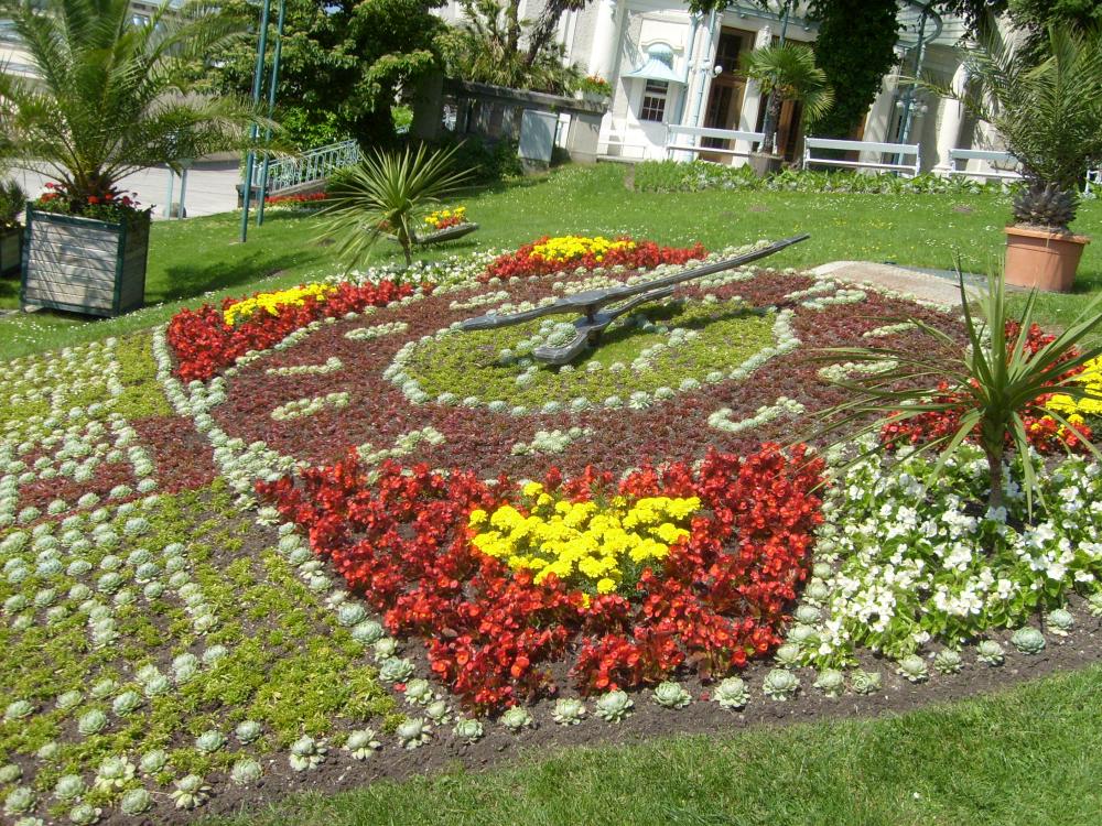 Много цветов вокруг. Часы сделаны в цветочной клумбе, причем механизм не механический, поэтому внутри часов есть место, где сидит работник и поворачивает стрелку. Цветы меняют постоянно, причем ставят лестницу и нее цветы сажают.