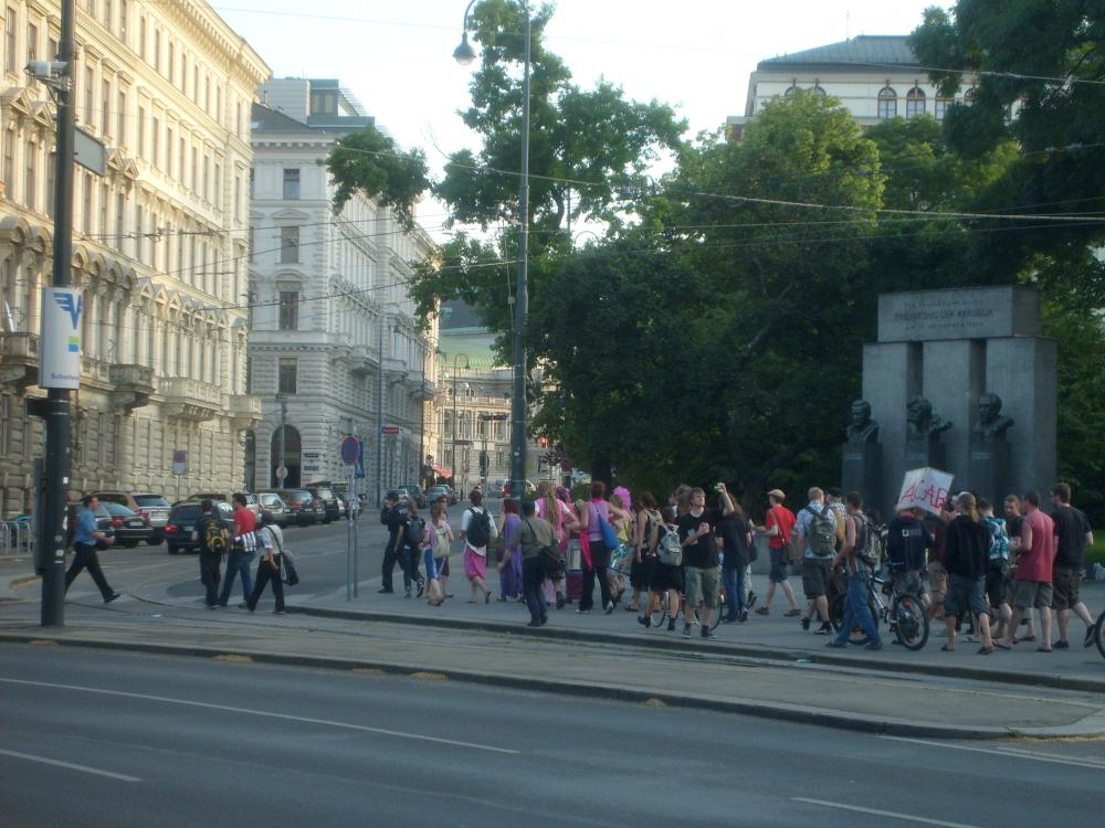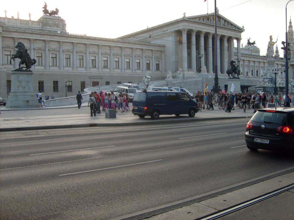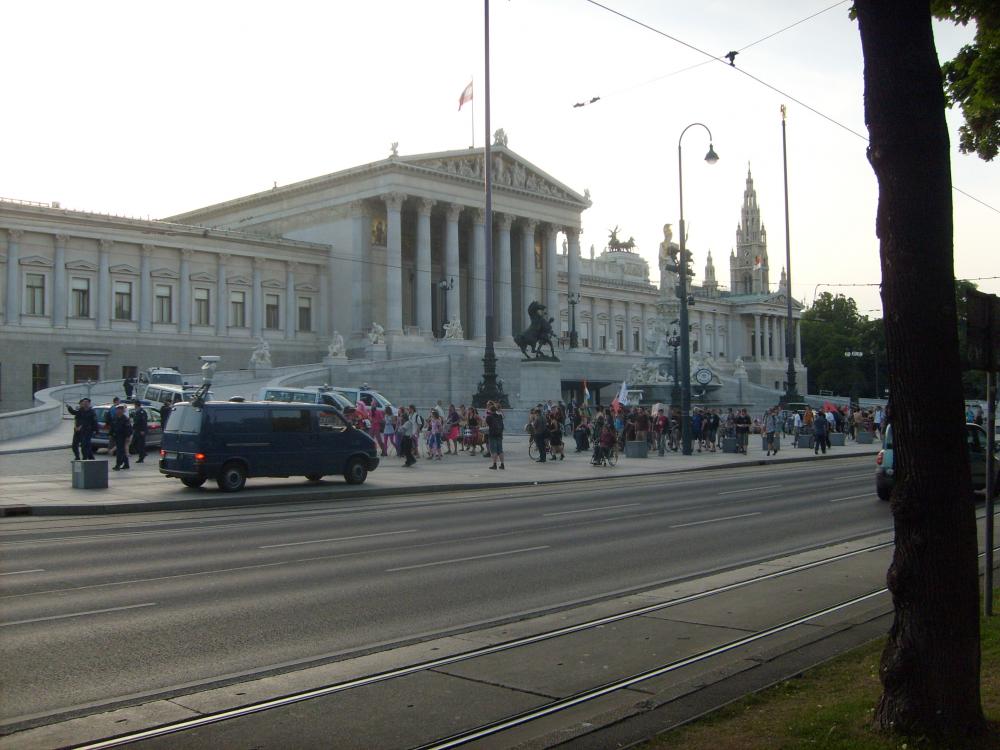 Около здания парламента проходила демонстрация недовольных. Чем здесь можно быть недовольным, не знаю. Сначала выступали, что-то говорили. Люди одеты очень интересно, мы сначала мы решили, что это народ нетрадиционной ориентации. Потом с музыкой пошли по улицам. Их охраняла полиция на мотоциклах.
