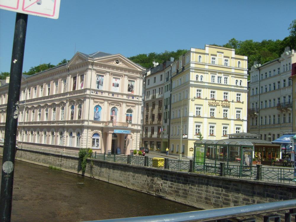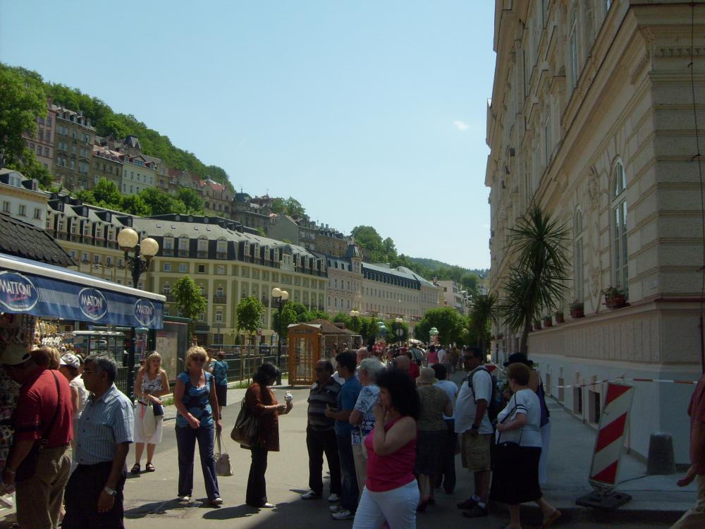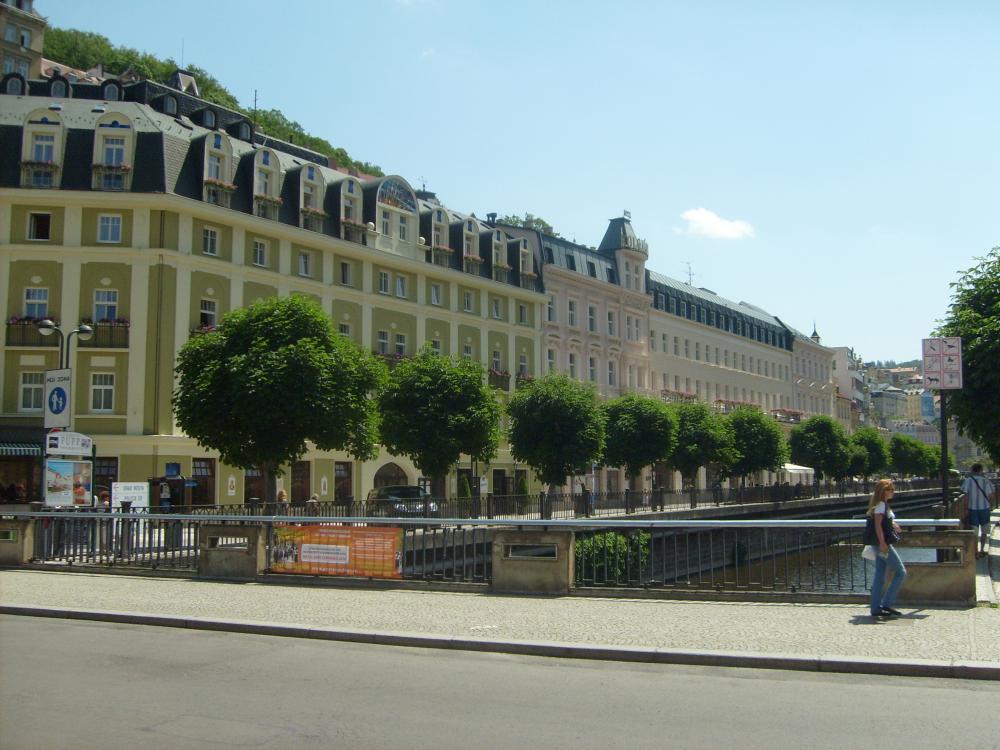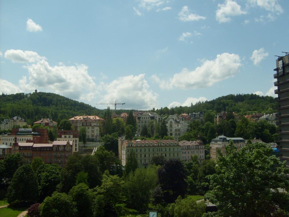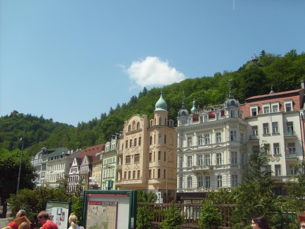 Мы приехали в Карловы Вары в очень жаркий день. Город находится в красивом ущелье на высоте 400 метров, окруженный лесами.