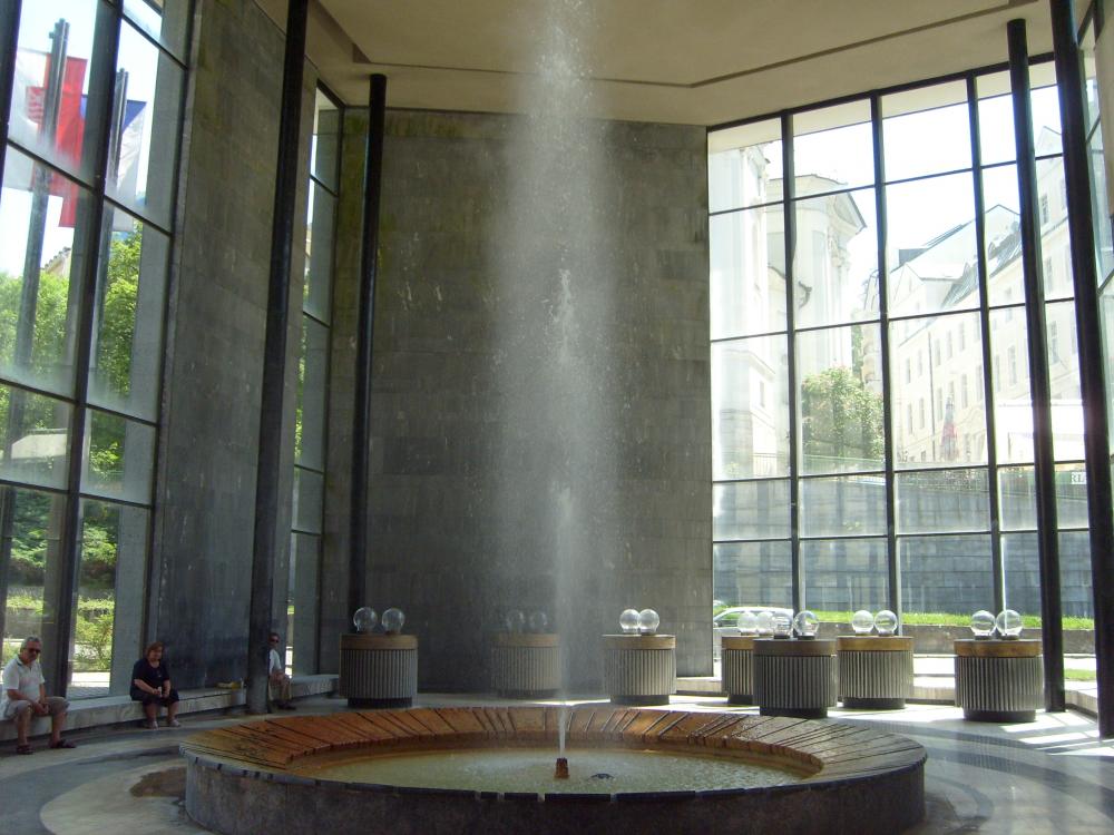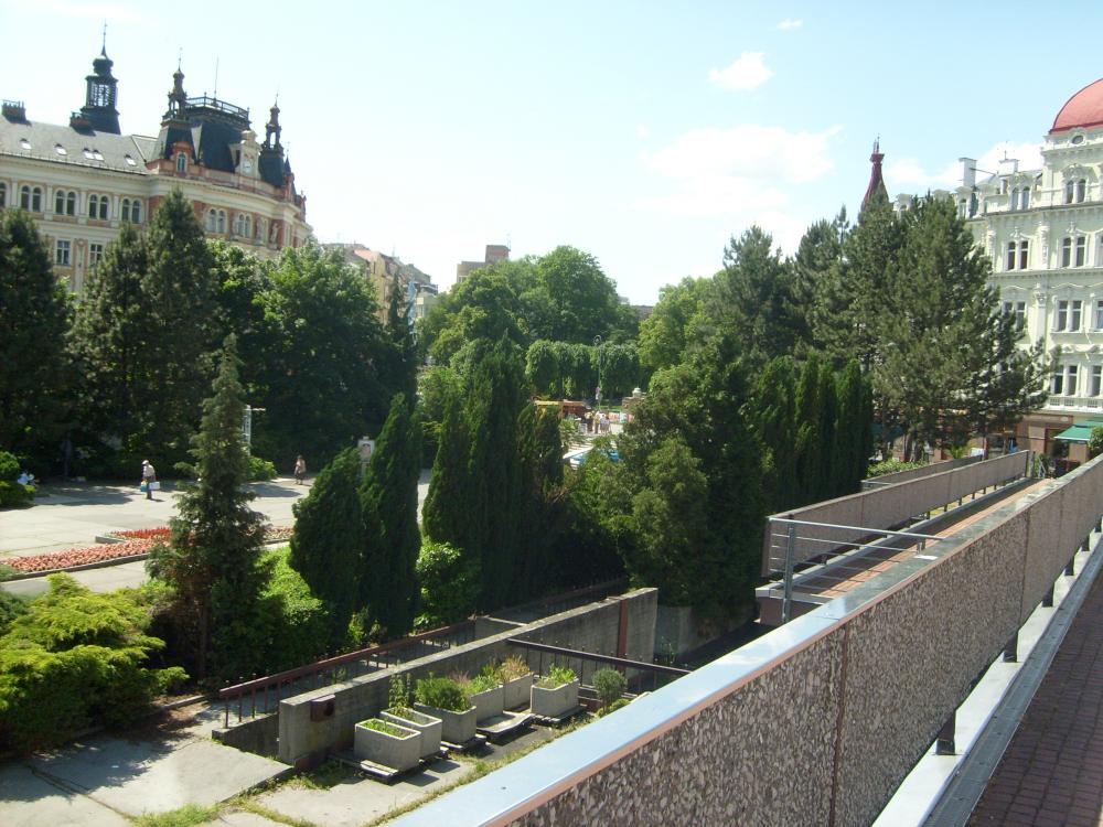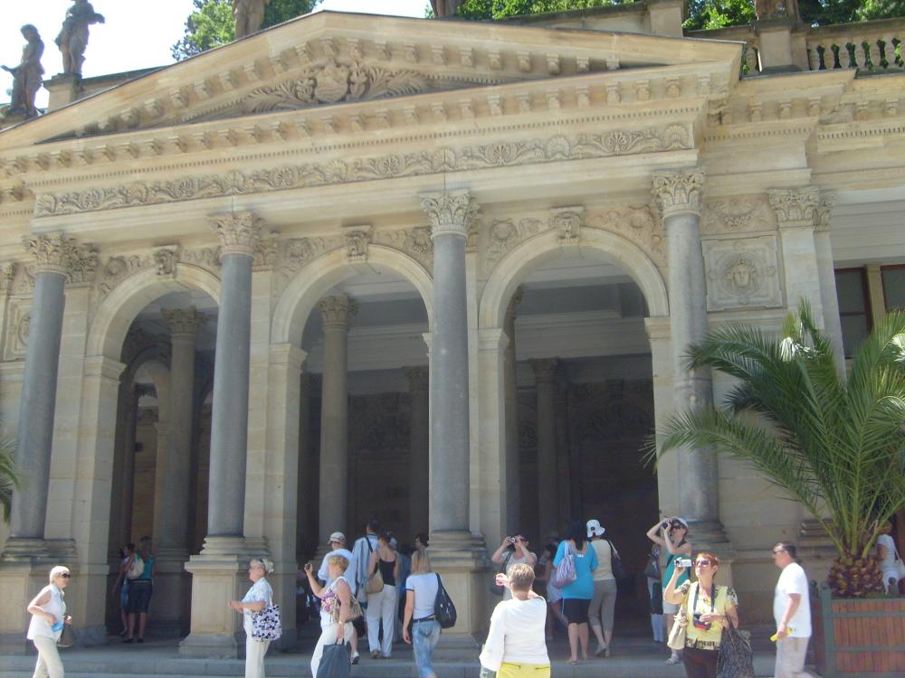 Мы прошлись по всем термальным источникам, каждый хорош по своему. Очень красивая Мельничная колоннада, в которой находится пять источников. Эти источники были найдены в середине 18 века, красиво оформлены. Они называются «Русалка», «Скальный», «Мельничный», «Вацлав» и «Либуше». У всех температура больше 50%, не даром река, по которой они находятся, называется Тепла(Теплая).