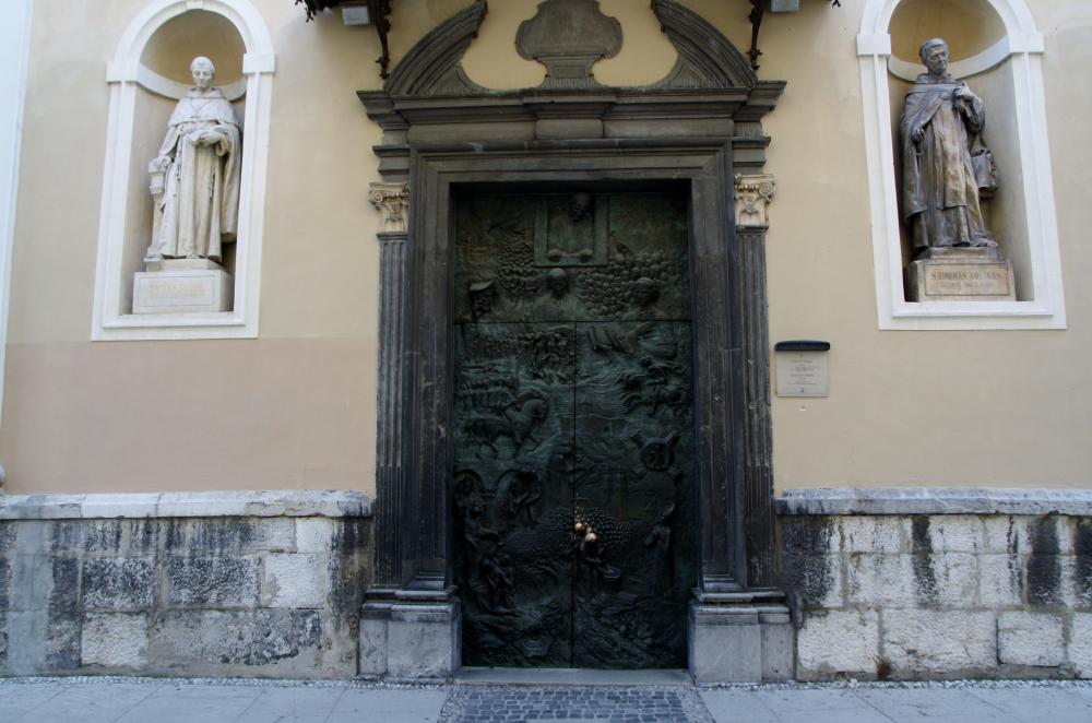 Собор Святого Николая. Очень интересная дверь. Ее поставили недавно в честь посещения Любляны Папой Иоанн Павлом II. Здесь даже сделали две таких двери. Главная посвящена принятию христианства в Словении, а на другая посвящена Люблинской епархии. На ней шесть епископов.