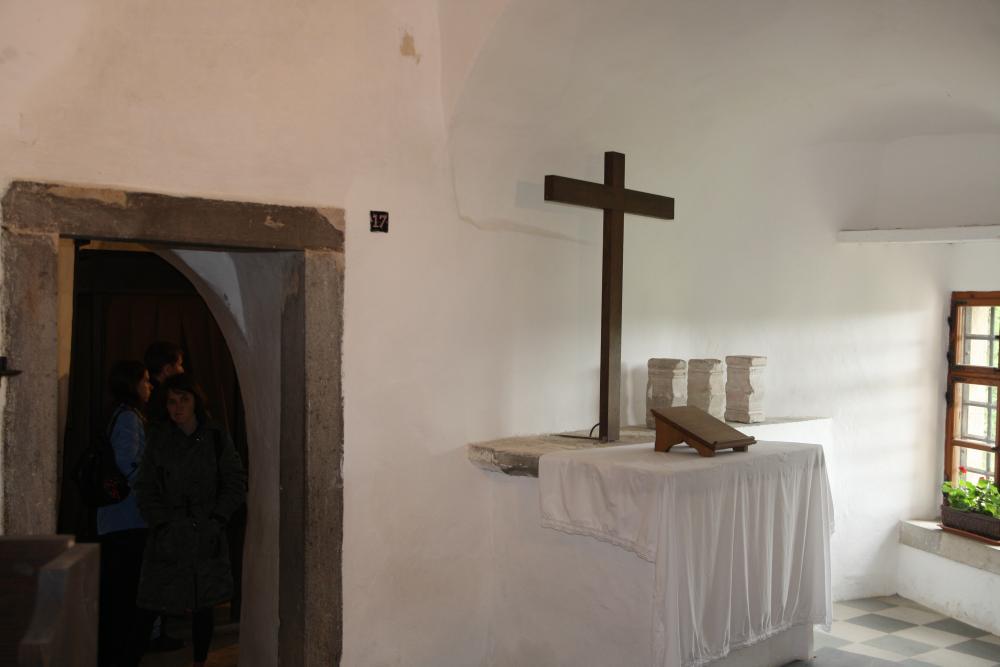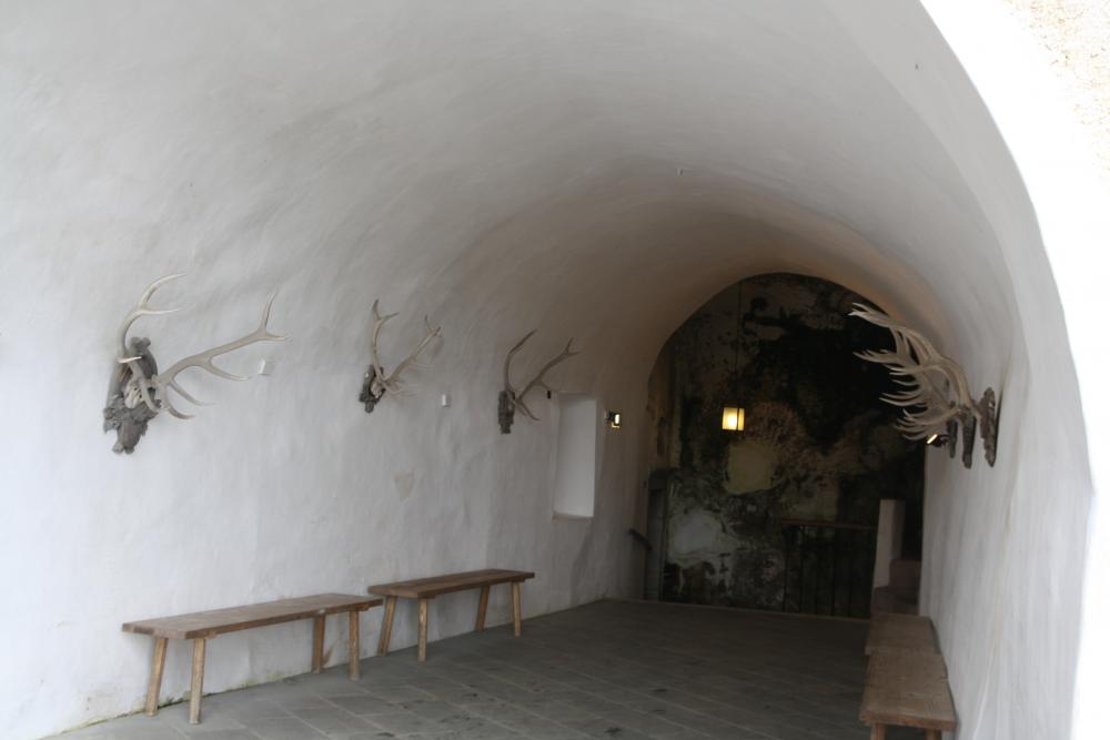 Под замком и внутри скалы карстовые пещеры длиной до 20 километров. Они даже раньше использовались, как конюшни.