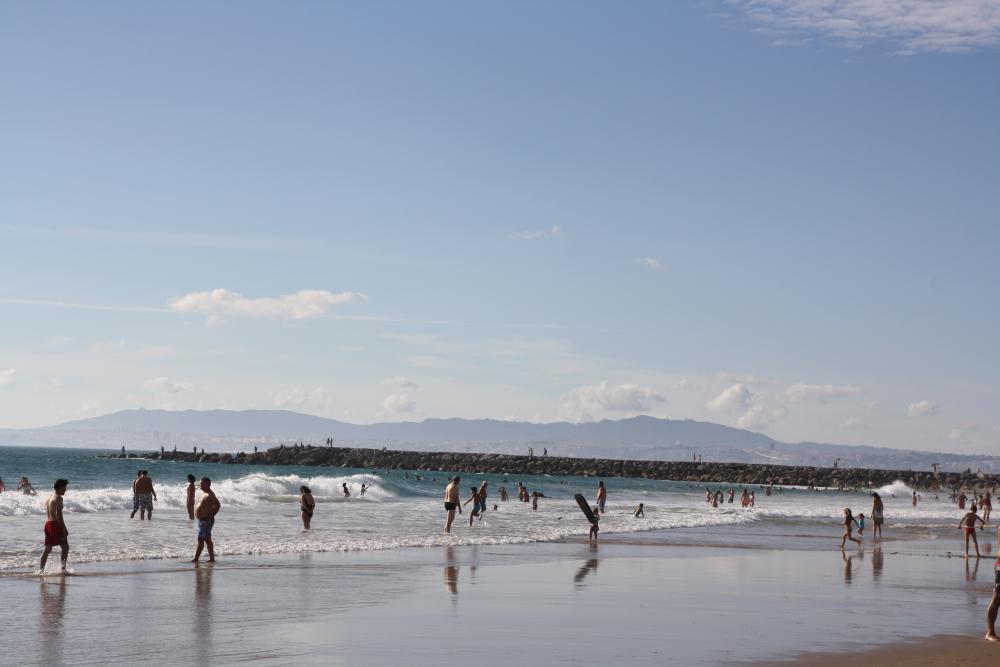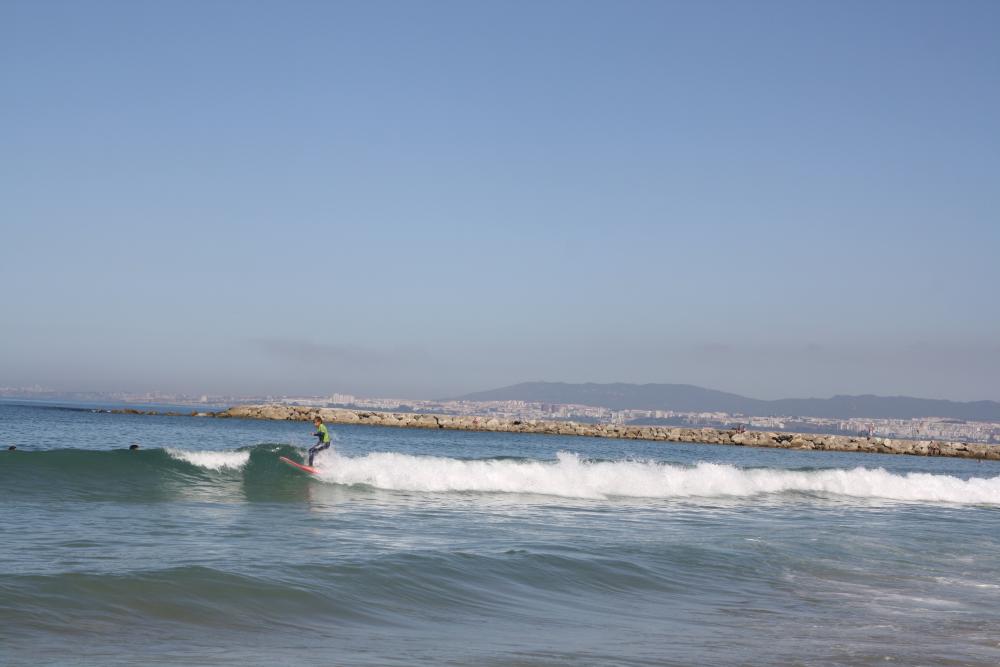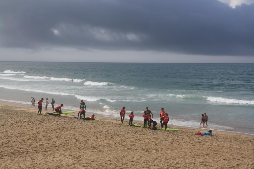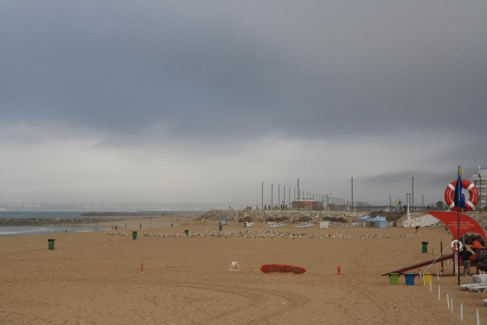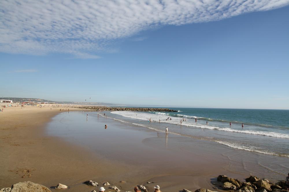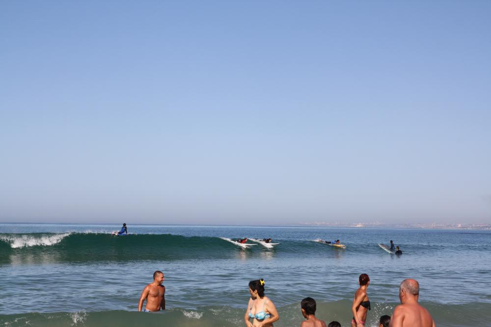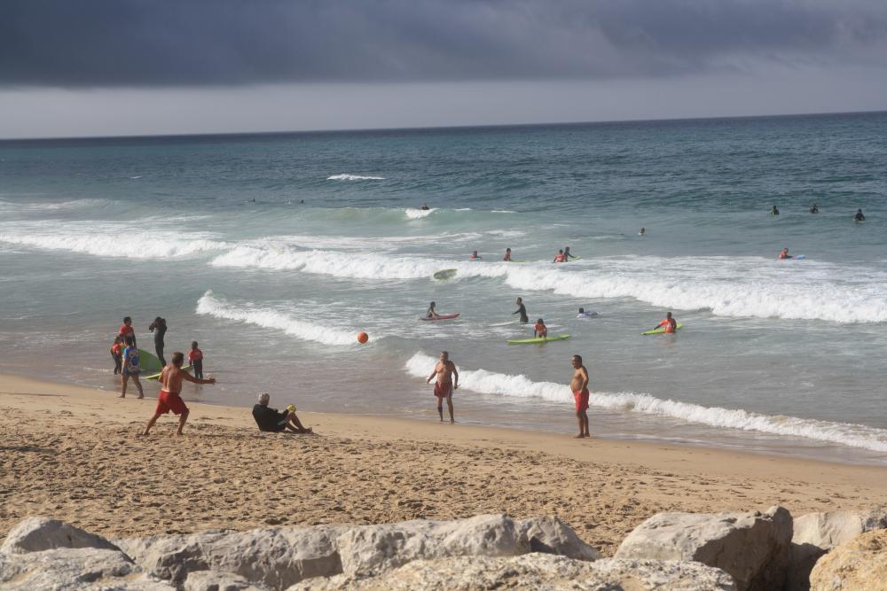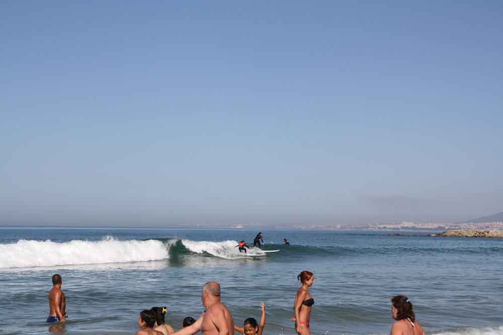 Немного выше она бывает только во второй половине сентября. Португальцы купаются все время, несмотря на постоянную волну. Спасатели тоже все время на пляже, плавать не разрешают. Все время стоит красный флажок. Народ заходит не очень далеко, но зато серфингистам раздолье. Дети пяти, шести лет уже тащат за собой доски для серфинга. Создаются группы, в которых обучают серфингу. Занимаются утром и после обеда.