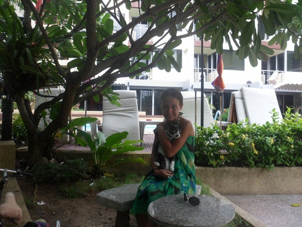 Территории в отеле практически нет-несколько цветов и огромный мангустин(я его обдирала с балкона номера)). Есть бассейн. По территории ходит важная соседская кошка с которой мы подружились))