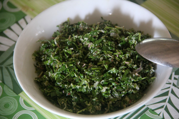 Из мелко порубленных листьев салата с красным луком, кокосом и гоутколой. Встречается редко. Увидите-берите не задумываясь-это вкусно!))
