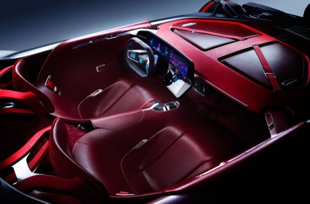 Интерьер также отличается футуристичностью и роскошью. Таким образом, салон обшит красной кожей и украшен деревом. Под "капотом" находится панель, в которой установлены два кожаных чемодана для багажа, а на приборной панели установлены OLED экраны, с помощью которых осуществляется управление системами автомобиля.