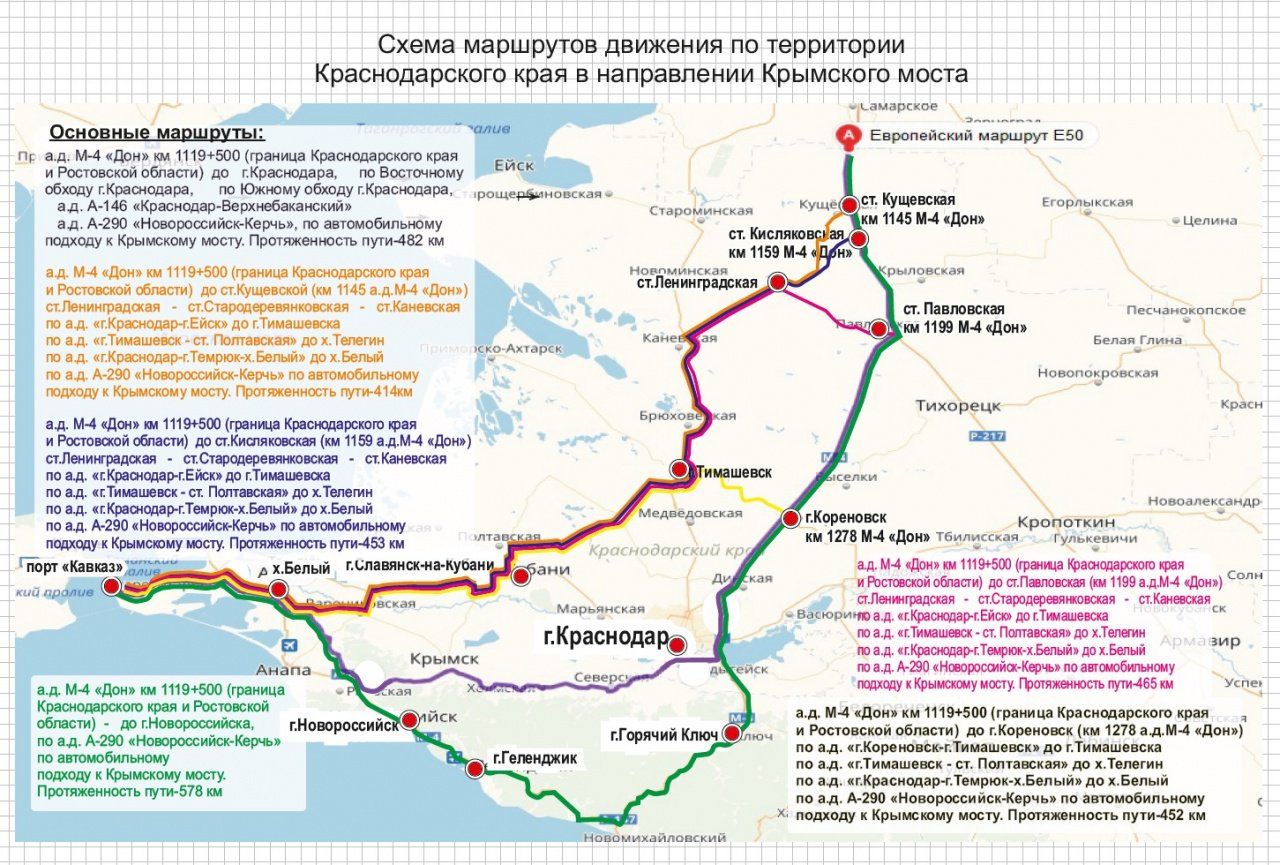 В заключение — самый короткий маршрут. Выехав за пределы Ростовской области, добраться до 1145-го км трассы М4 «Дон», где следует повернуть на станицу Каневскую (поворот в районе станицы Кущевской, не перепутать). Затем следовать в направлении Тимашевска и хутора Белого. После — выехать на трассу Новороссийск — Керчь, которая приведет к Керченскому мосту. По трассе А290 надо двигаться до новой развязки на Таманском полуострове (пропустить ее сложно), от которой остается 40 км по автоподходу до моста. Этот путь является самым коротким по километражу, составляя порядка 390 км.