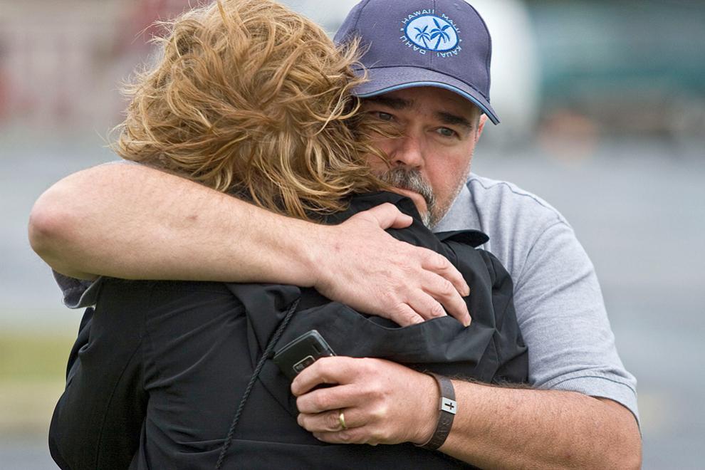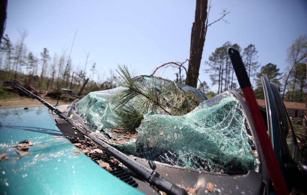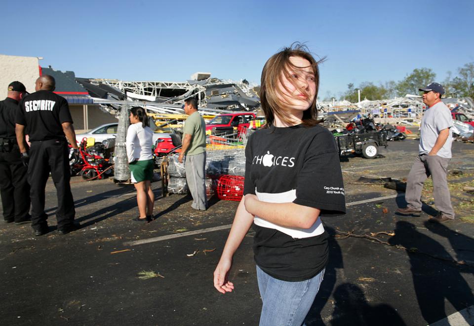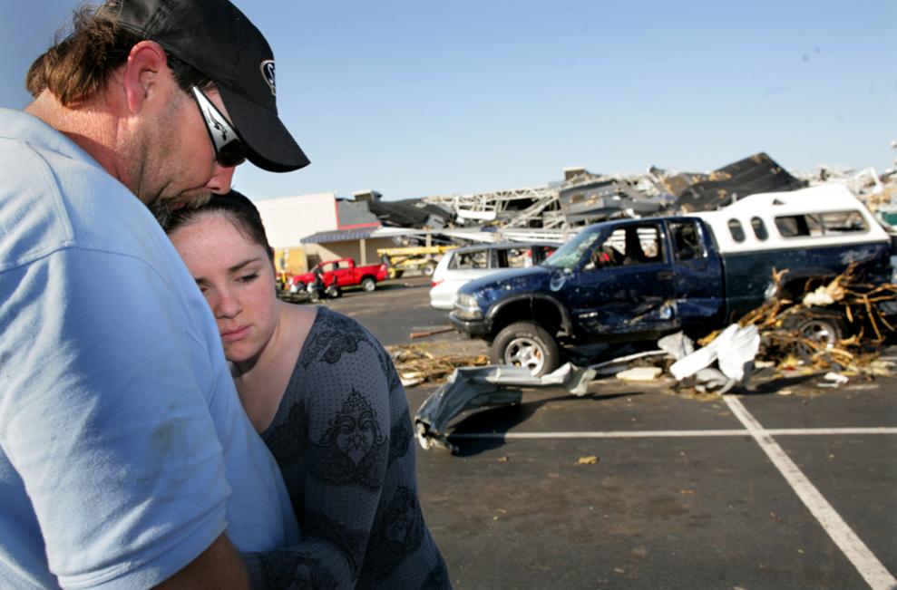 1. Крис Нельсон с 15-летней дочерью Андреа на стоянке перед магазином «Lowe's» в Сэнфорде, штат Северная Каролина на следующий день после торнадо. Нельсоны были в магазине, когда это случилось. Они вернулись на следующий день за своим автомобилем (на заднем фоне справа). (AP Photo/Ted Richardson)