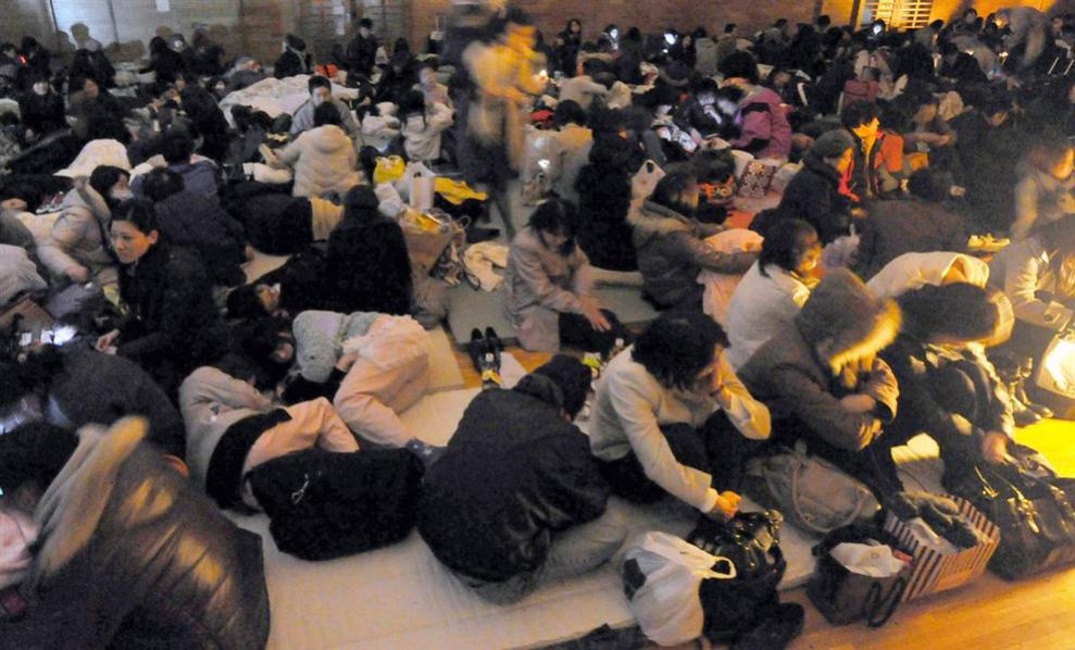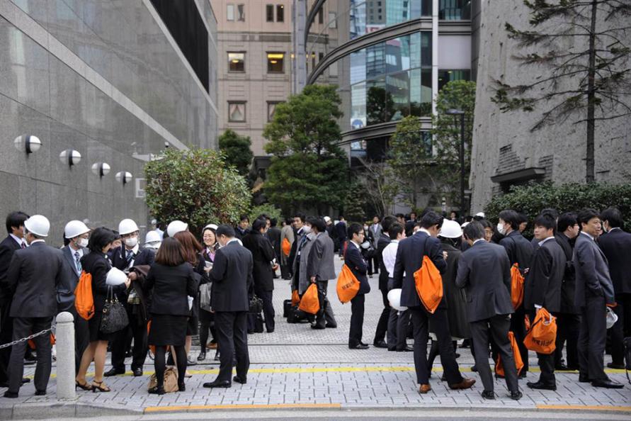 Офисные работники стоят на тротуаре в районе Shiodome возле Токийского залива и осматривают пошатнувшиеся высотные офисные здания и гостиницы вскоре после землетрясения.