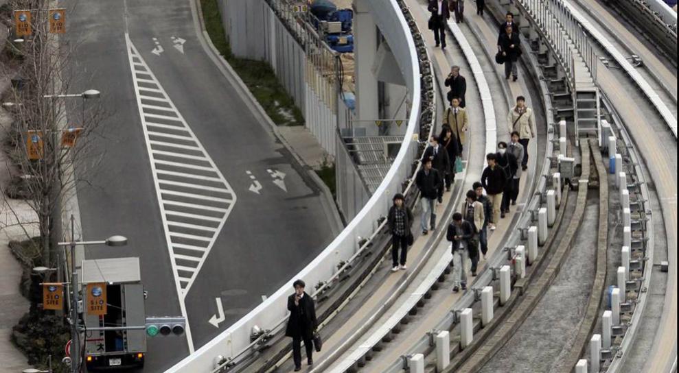Пассажиры поезда «Yurikamome» идут на станцию «Shiodome» возле Токийского залива.