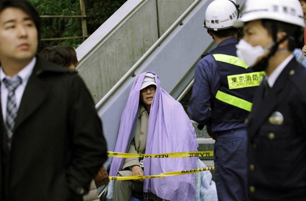 Завернутый в одеяло мужчина сидит возле здания в финансовом районе Токио после землетрясения 11 марта.