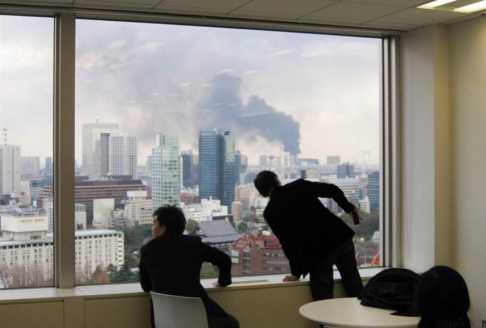Мужчины смотрят на столб дыма, который поднимается от небоскреба в Токио после землетрясения.