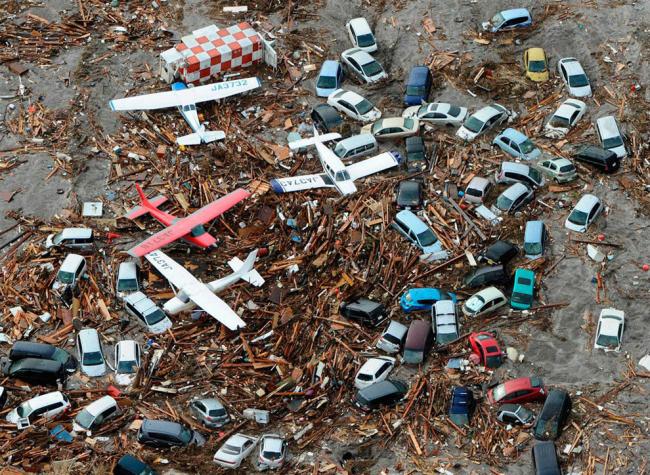 На изображении, полученном на основе видеозаписи телекомпании nhk, видны автомобили, которые плывут по затопленной улице после цунами в префектуре Мияги.