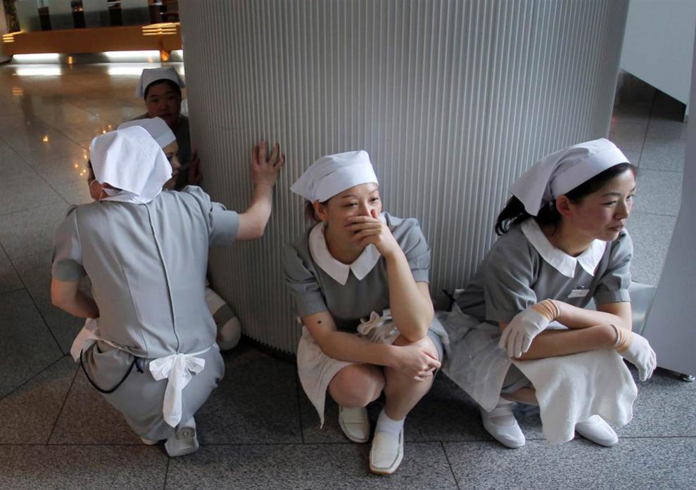 Репортеры из филиала агентства Associated Press в Токио прячутся под столом во время землетрясения, 11 марта.