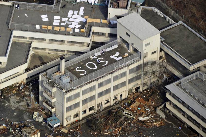 Люди, ожидающие эвакуации после землетрясения в городе Кесеннума в префектуре Мияги, написали на крыше здания слово «SOS», 12 марта. (Yomiuri / Reuters)