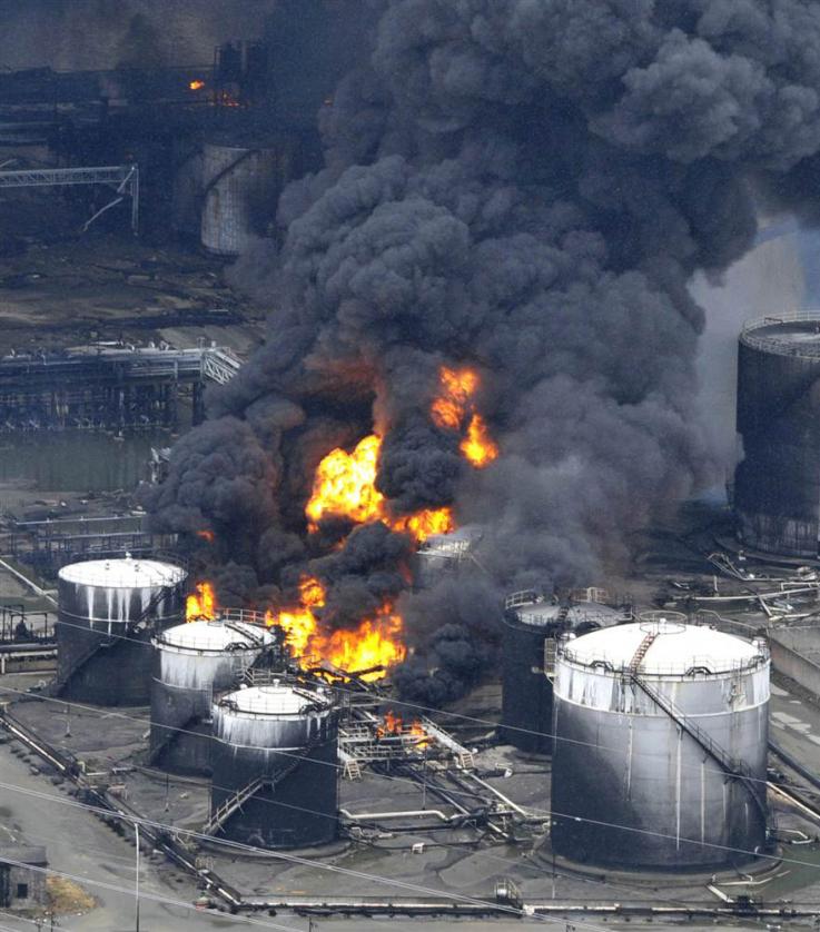 Клубы дыма поднимаются от горящего завода в промышленном районе Сендая, Япония, 12 марта. (AP)