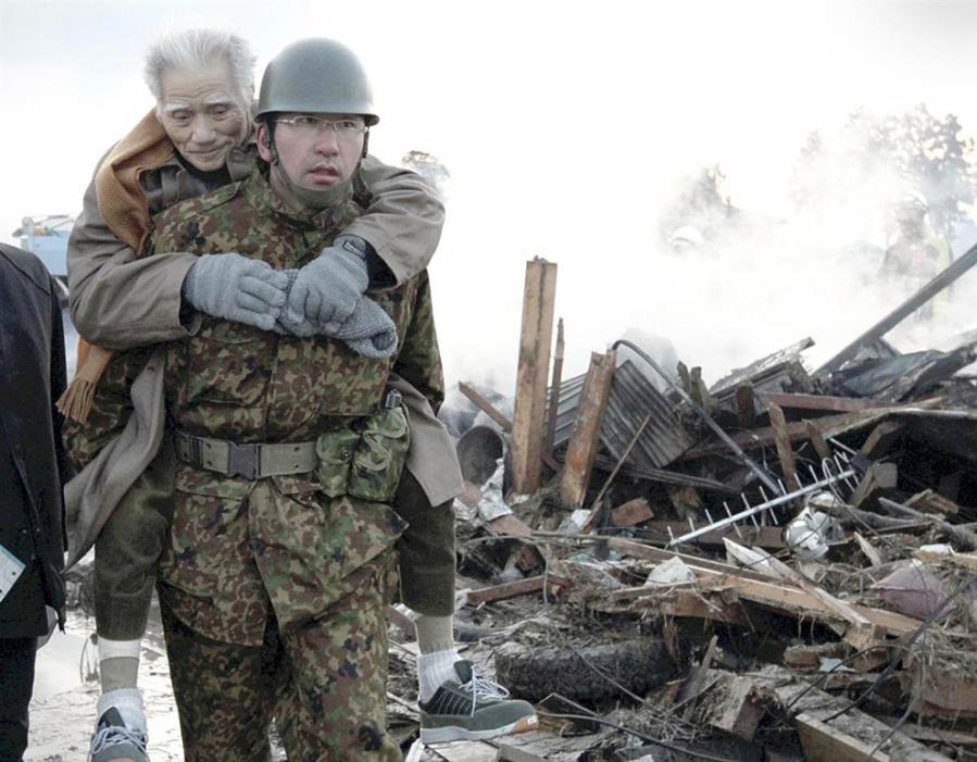 Военнослужащий сил самообороны Японии спасает мужчину, который оказался под завалами, в городе Кесеннума в префектуре Мияги на северо-востоке Японии, 12 марта. (Kyodo / Reuters)