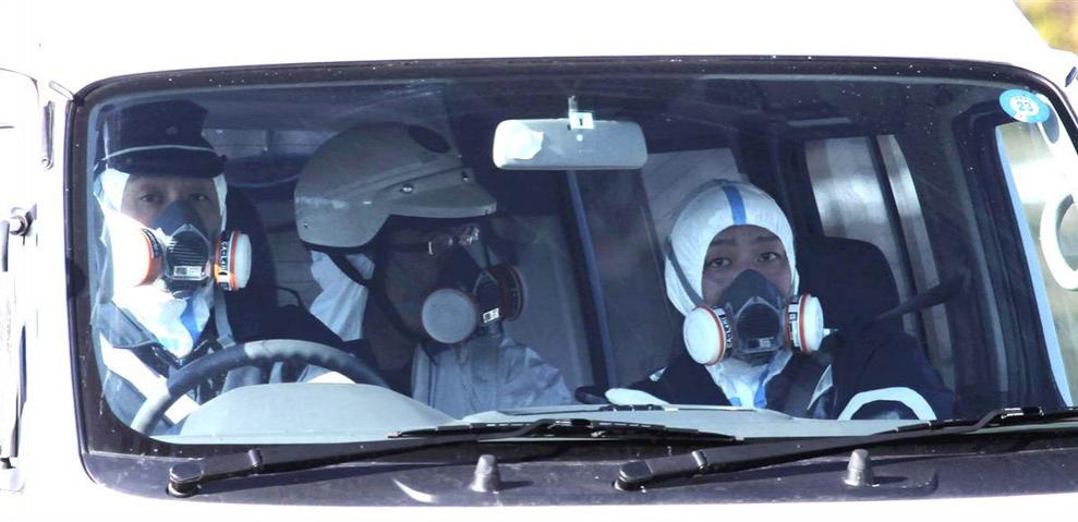 Полицейские в респираторах патрулируют на автомобиле территорию вокруг реактора №1 на АЭС «Фукусима Дайни» в Okumamachi в префектуре Фукусима на севере Японии. В пятницу возникли опасения, что на АЭС, пострадавшей в результате сильного землетрясения и цунами, может произойти взрыв. (Kaname Yoneyama / AP)