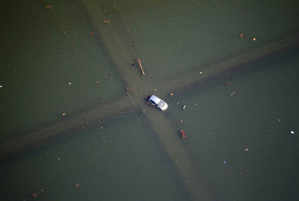 Автомобиль стоит на затопленном перекрестке в Сендае на северо-востоке Японии, 12 марта. Мощное землетрясение и цунами принесли разрушения на северо-восточное побережье Японии, и в некоторых районах затопленных городов вспыхнули пожары. (Jo Yong-hak / Reuters)