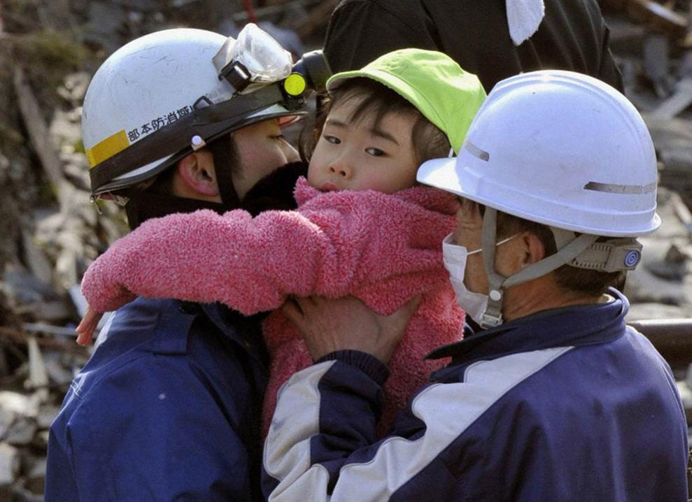 Спасатели держат на руках девочку, найденную в здании после землетрясения и цунами в городе Кесеннума в префектуре Мияги на северо-востоке Японии, 12 марта. (Kyodo / Reuters)