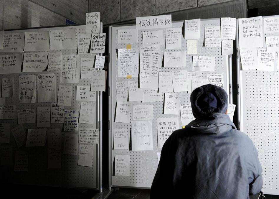 Местный житель читает заметки на доске объявлений в эвакуационном центре в городе Офунато в префектуре Иватэ, Япония, 12 марта. (AP)