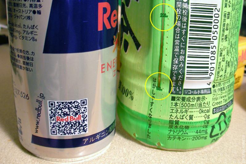35) Red Bull в маленьких (200 мл) банках продается только в Японии, но производится в Австрии — как и тот, что возят к нам. На этикетке пол-литровой бутылки зеленого чая (без сахара!) емкость размечена с шагом в 100 мл.
