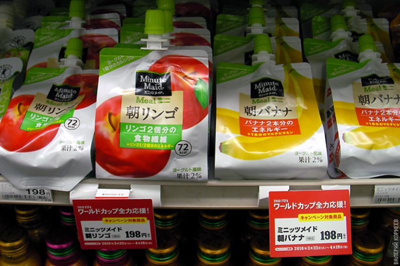 38) Охлажденное желе в пакетиках с соской иногда доползает до «Азбуки вкуса», но вообще в России его днем с огнем и по нормальным ценам не сыщешь (Rich в похожей упаковке выпускает фруктовое пюре, это другое). Minute Maid с кусочками фруктов, другие производители добавляют витамины и «энергетические» компоненты.