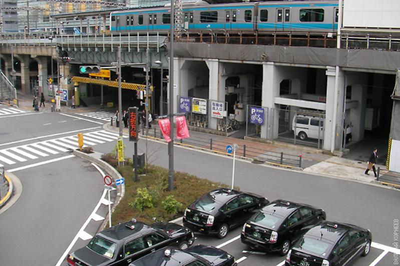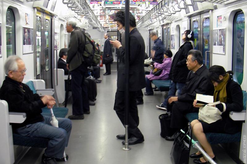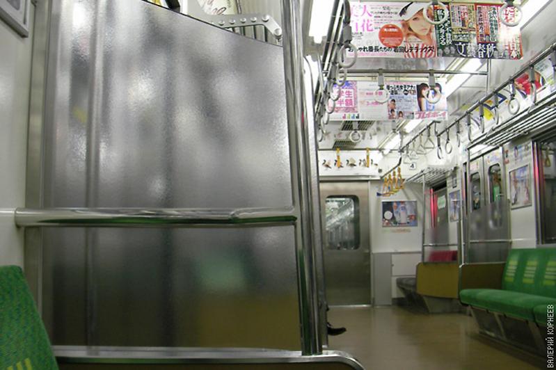 82) На загруженной кольцевой Яманотэ часть вагонов с увеличенным числом дверей и только откидными сиденьями.