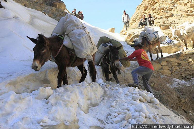 5) В начале весны в горах было еще не мало снега и путешественников ждали суровые, морозные ночи. На фото: гид с осликами прорубает тропинку в снегу, чтобы по ней смогли пройти лошади с поклажей.