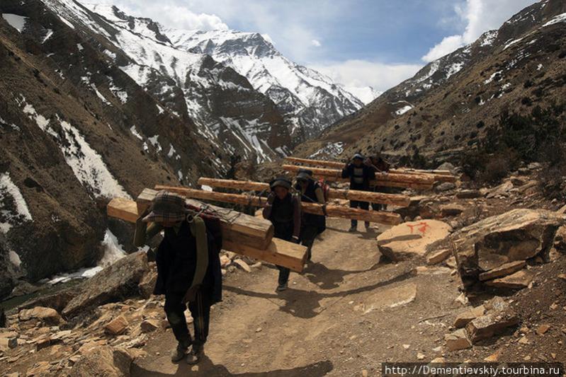 7) Высота около 4 тысяч метров. Местные жители несут наверх огромные брёвна для строительства домов, поскольку в горах нет древесины. Это - очень тяжёлая работа, которая по непальским меркам хорошо оплачивается.