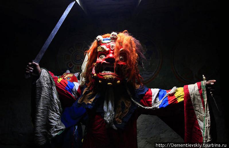 11) В поселке До Тарап путешественники провели два дня и смогли поучаствовать в ежегодном празднике бонской традиции. Вовремя праздника проводятся древние ритуалы, чтобы изгнать злых духов, привлечь благополучие, богатство и молиться за мир. На снимке: лама в специальном костюме перед началом ритуальных танцев.