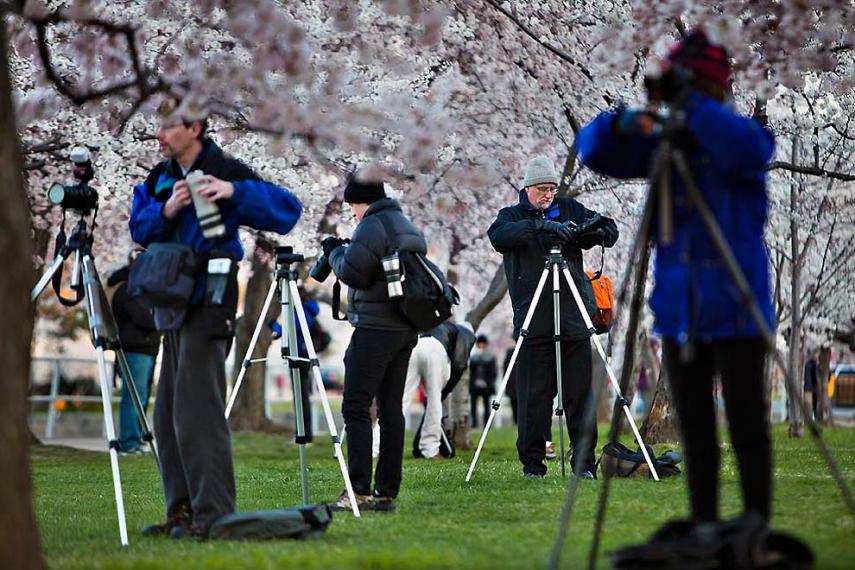 9. фотографы устанавливают фотооборудование на штативы, чтобы запечатлеть цветущие вишневые деревья в вашингтоне. (jim lo scalzo / epa)
