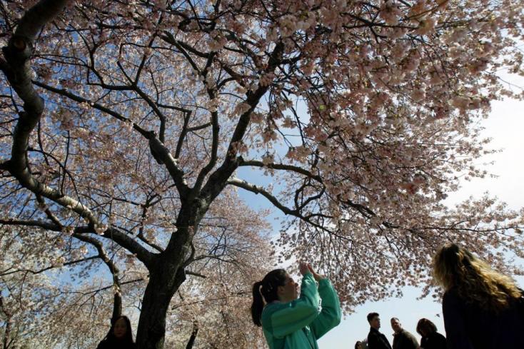 11. Девушка фотографирует цветущую сакуру во время Фестиваля цветения вишни в Вашингтоне. По прогнозам Службы национальных парков США, в этом году пик цветения сакуры придется на период с 29 марта по 1 апреля. (Jose Luis Magana / AP)