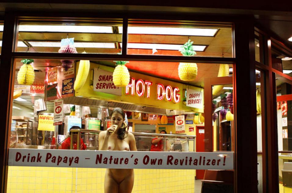Фотограф и художник в одном лице Эрика Симон – обычная жительница Нью-Йорка. Она так же как все ходит за покупками, расчищает снег перед домом, ездит в метро и покупает хот-доги. Есть лишь одно но…точнее, ню. Все это она делает голой! Оставаясь лишь в обуви и иногда в головном уборе, Эрика выходит на улицы города. При этом она утверждает, что ее цель (а также новой выставки ее работ под названием «Nue York») вовсе не эпатировать публику, а, наоборот, привлечь внимание к проблеме наготы и научить других не стесняться своего тела.