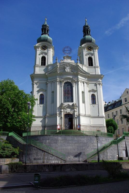 24. Костел. Первый костел, виденный нами в Чехии. Находится совсем рядом с павильоном, где из-под земли бьет фонтан. Внутри мы побывали, но фото показывать не буду – слишком кривое получилось. На костелы изнутри будем смотреть в следующих рассказах.